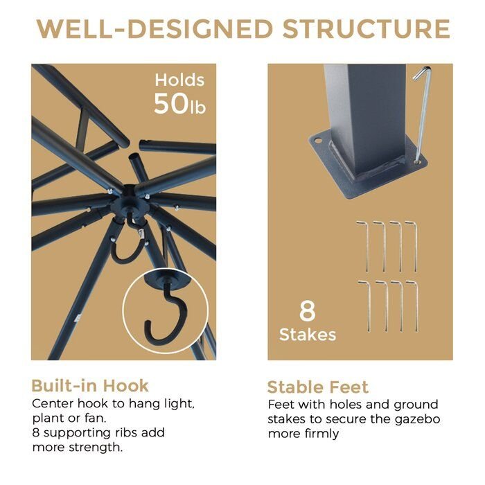 4.Multipurpose: This fully assembled outdoor gazebo offers 100 square feet of covered area, enough for 5~9 people. Outdoor pergola perfect for your backyard, garden, lawn.Tents can also be used as shelters for special events such as weddings, birthday parties and picnics