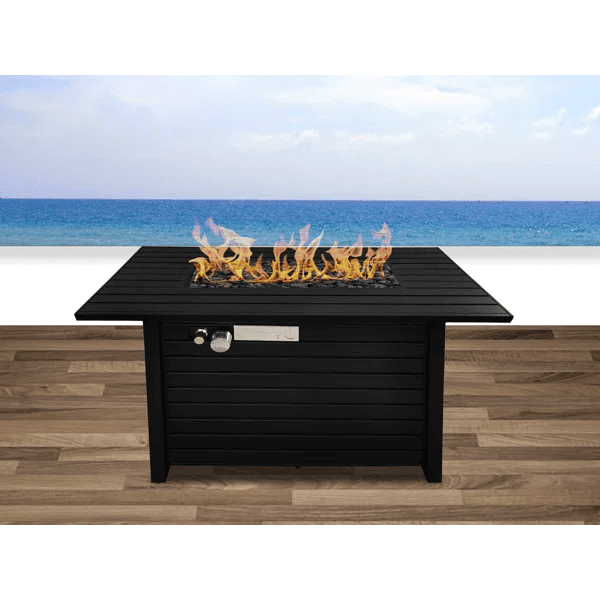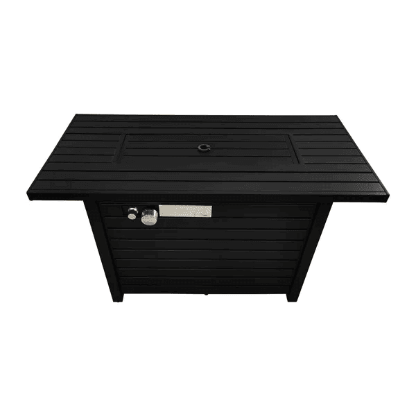 It features a propane-fueled fireplace insert, complete with a lid, polyester cover, lava rocks, and glass fire beads. Easily turn this firepit on and off with the built-in push-button, and adjust the flame as needed.