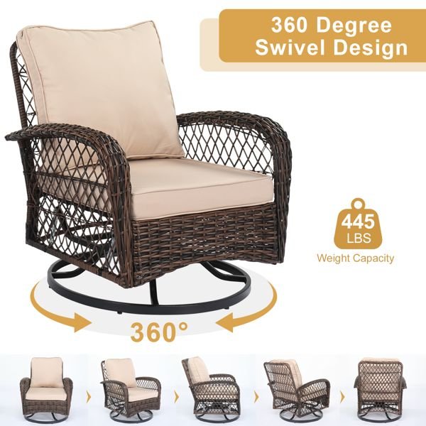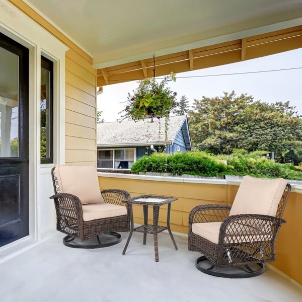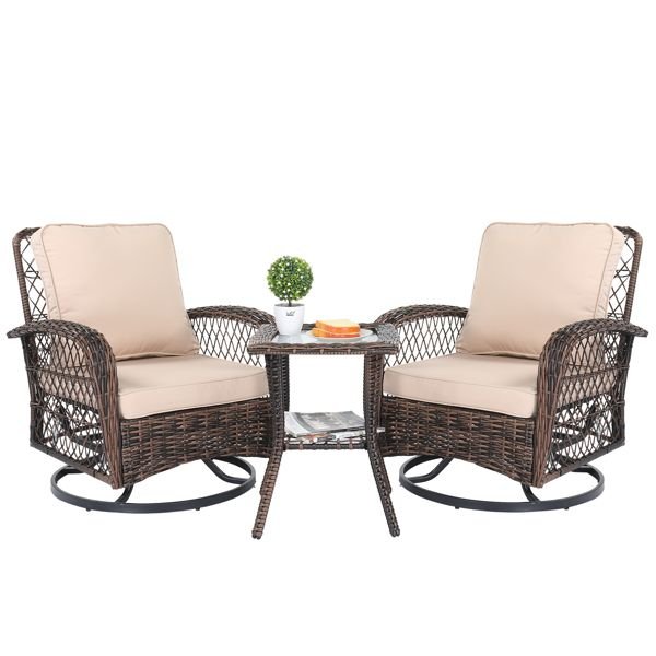 Immerse yourself in the ultimate outdoor relaxation with our 3 Pieces Patio Furniture Set, featuring Outdoor Swivel Gliders Rockers that redefine comfort and style. This exquisite set, designed to enhance your porch, deck, or backyard, includes two swivel rocking chairs and a chic glass-top side table, all adorned in elegant gradient rattan with plush cushions. Crafted for durability and ease, this set promises not only a visually captivating addition to your outdoor space but also a haven for unwinding and enjoying serene moments outdoors. Whether it's a tranquil morning coffee or a leisurely evening chat, this bistro set invites you to savor every moment in the comfort of your own outdoor retreat.