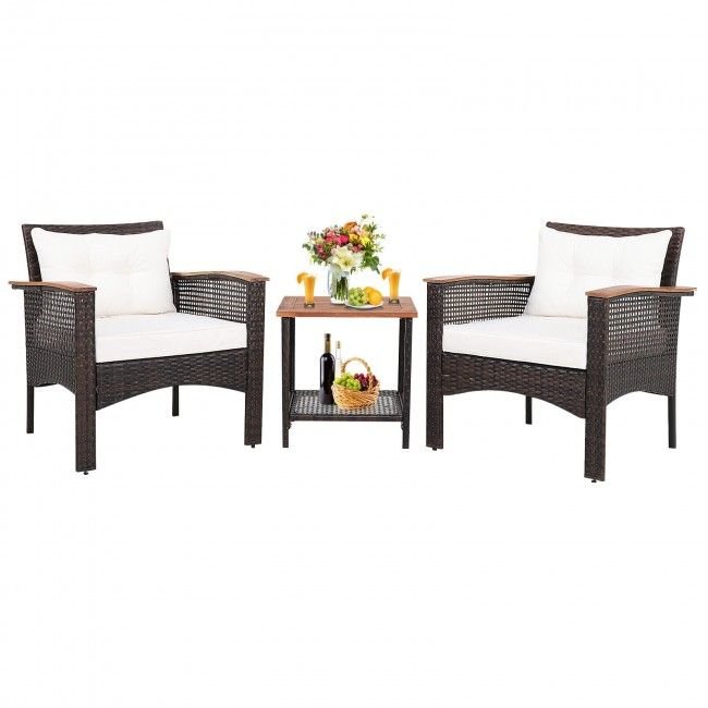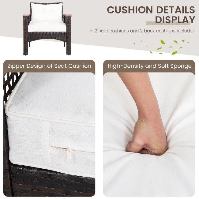 Including two back cushions and two seat cushions, this rattan set will offer you a comfortable sitting experience. The wide sitting area with ergonomic armrests and backrest will quickly get rid of your tiredness. Moreover, the seat cushion cover with zippers is simple to remove and maintain. The main frame is made of heavy-duty steel, which is rustproof and anti-deformation. The bottom X-shaped structure of sofas and adjustable footpads on the front sofa legs highly improve the stability. Both the armrests and tabletop are made of premium acacia wood, which is sturdy and durable, too. The main bodies of 3 pieces are wrapped with weatherproof PE rattan, ensuring long-lasting outdoor use. All in all, this 3-piece patio rattan sofa set is perfect for you to relax outdoors.