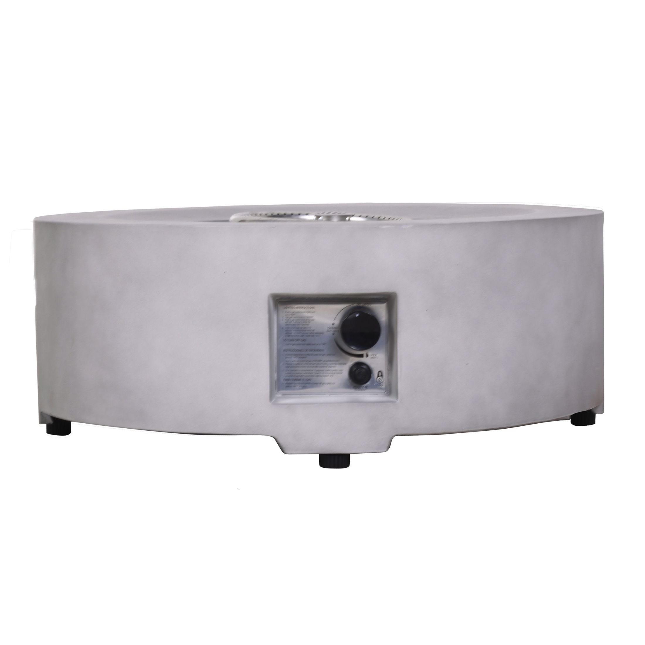30 Inch Round Fire PitThis gas fire pit is made of TerraFab (eco-friendly composite material) in natural concrete effect. It is 40,000 BTU. This fire pit ensures CSA-approved safety, enhanced quality, and improved performance for your everyday use. Each piece of the fire pit is strictly tested before leaving the factory. It is easy to operate with the push-start ignition and adjustable flame option. With a simple push at the pulse switch and a turn at the valve knob, the electronic ignition system can start a beautiful fire in no time. The four screw-in feet protect the hard/wood floor from scratches and scuffs when moving and also help level the fire pit on uneven ground. The included weather cover can also bring the best protection to this fire pit.
