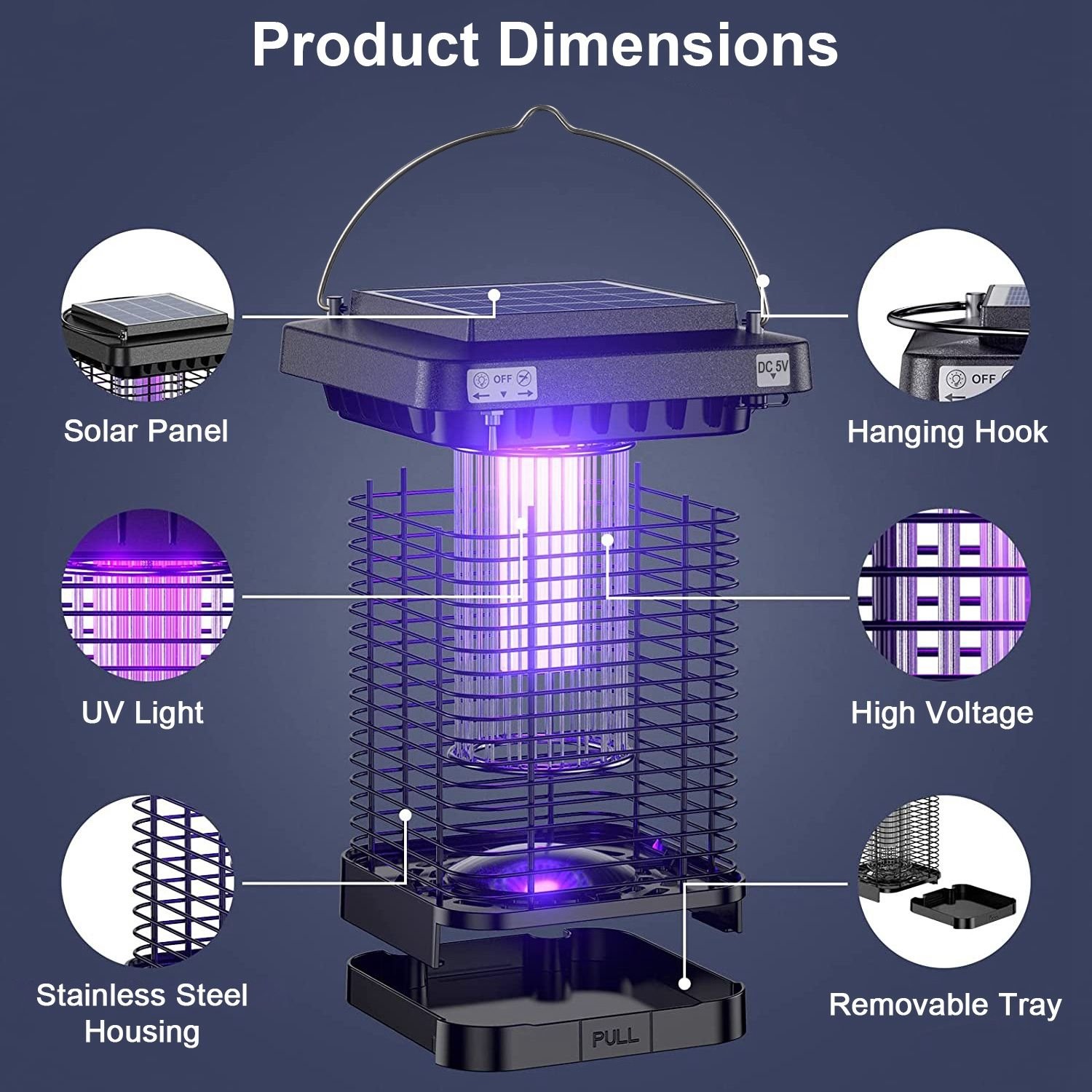 *Effective Bug Zapper*:Lure the annoying mosquitoes via UV light and kill them with electric shock. Then the mosquitoes can be electrocuted by the 1300V high voltage grids. This is an effective physical mosquito control method.
