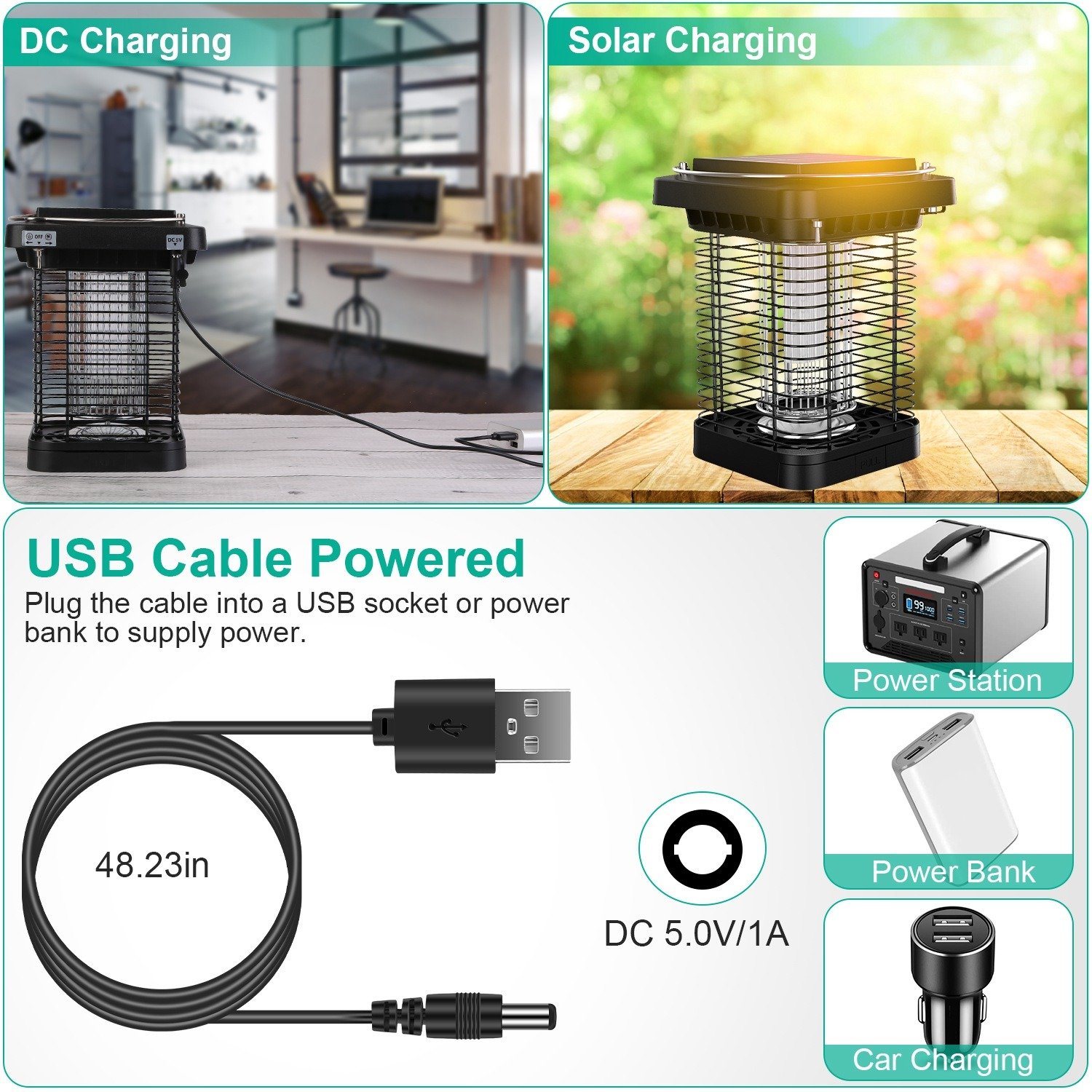 3.The bug zapper uses DC5.5 charging as a main charging method and solar panel as an auxiliary method.