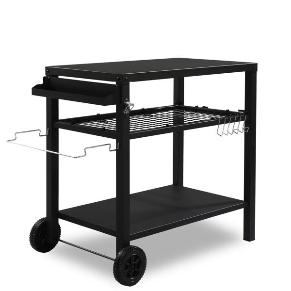 Home > Outdoor Grill Cart Three-Shelf Grill Table, Movable BBQ Trolley Food Prep Cart with Two Wheels & Hooks, Black