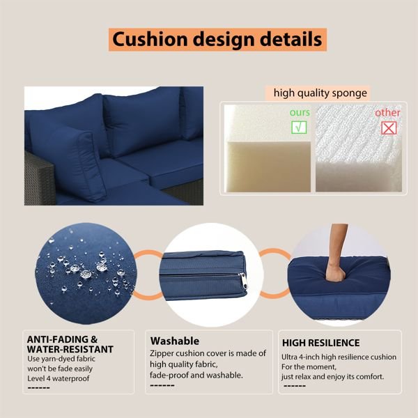 [COMFORTABLE & MODERN DESIGN]Our outdoor furniture cushions are 4 inches thick. High quality thick cushion with good rebound. Waterproof level 4, according to the experimental data test, the length of sun protection is 800H (mainly test the damage to the colour). Make you more comfortable when enjoying leisure time and outdoor activities with your family.