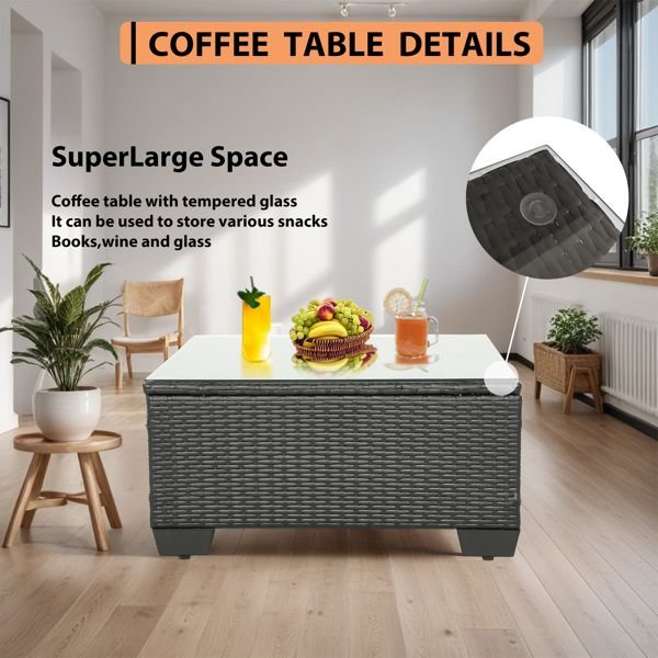 [EASY TO CLEAN AND MAINTAIN]Our outdoor patio furniture tempered glass table top and steel frame support the stability and balance of the sofa.The steel frame is made of Q195 stainless steel, not easy to deform, tear and rust. Removable tempered glass table top, easy to wipe and clean, zip cushion covers are made of high quality fabric, fade-resistant, waterproof and washable.