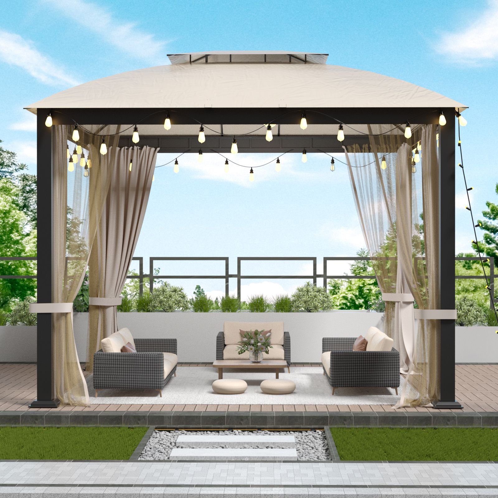 10X10FT Softtop Metal Gazebo with Mosquito Net&Sunshade Curtains,Sturdy Heavy Duty Double Roof Canopy,Galvanized Steel Design Outdoor Tent