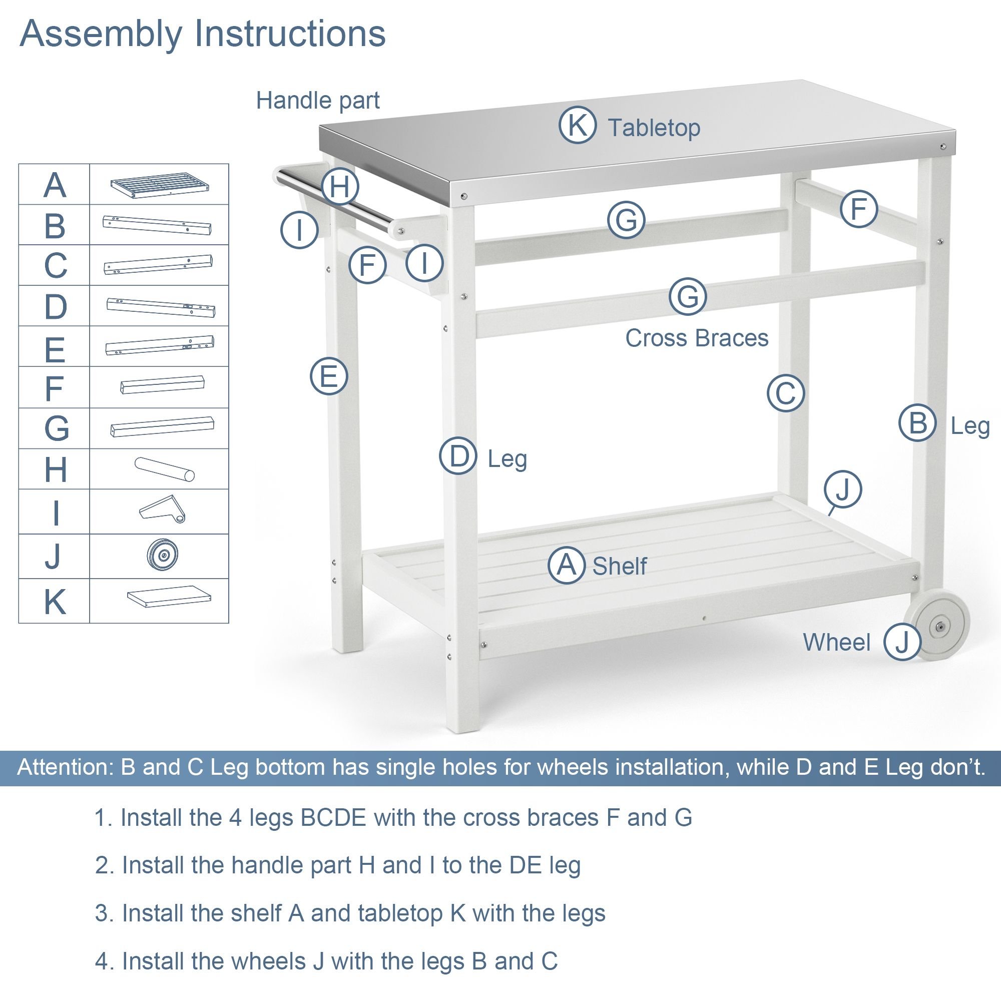 2.[All-weather Resistant Prep Table]Compared with plastic and other outdoor wood dining tables; the stainless steel table top is more durable and withstands rain; wind and sun. Plastic will inevitably deform over time; and wood is prone to mold in humid areas and cracks under direct sunlight. Besides; this prep table has 2 wheels and 2 table legs. Compared with 4 wheels; it is more stable and not easy to shake; so it is suitable for use in all regions and any weather.