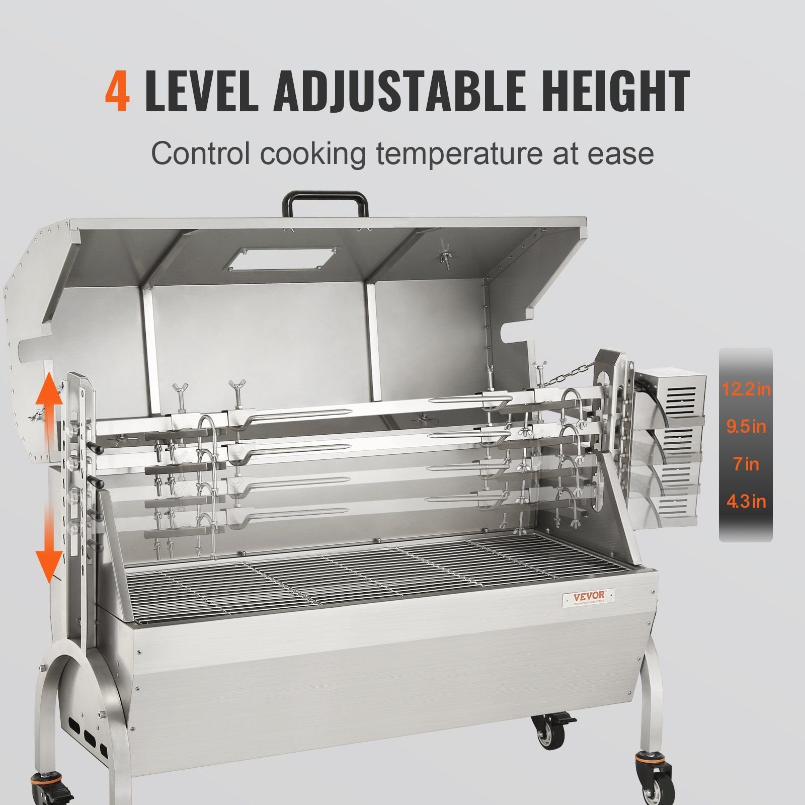 2.4-Level Height Adjustable: Designed with 4 holes placed on different heights for effortless adjustment of the hog roaster. The rotisserie kit has been crafted to control the cooking temperature. Adjustable height: 4.3"-12.2".