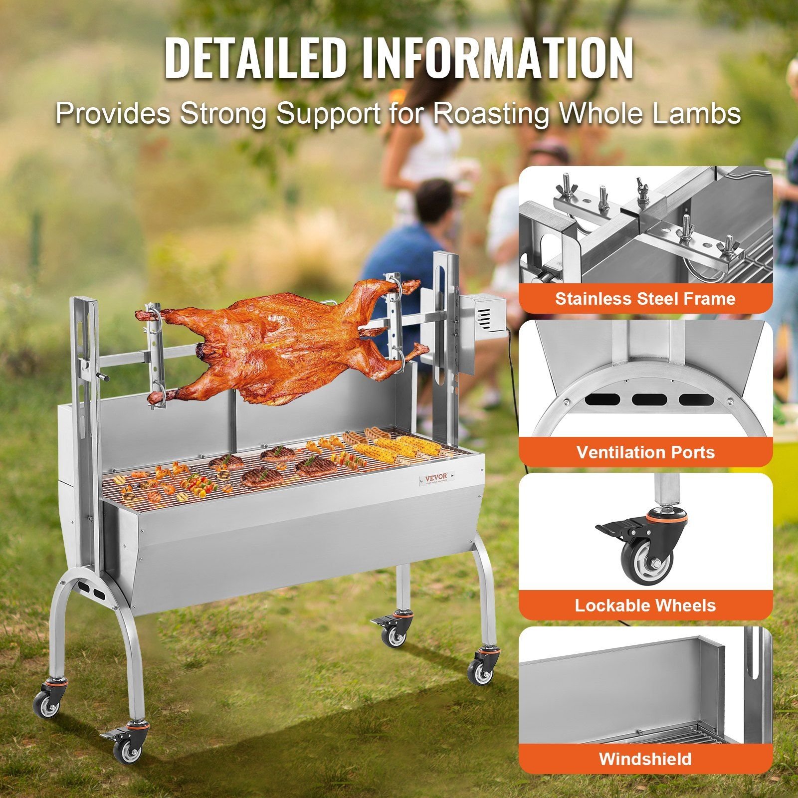 5.User-Friendly Design: The stainless steel rotisserie roaster comes with 4 detachable and lockable wheels, making it easier to move and providing more stability while cooking. Additionally, it includes 2 seasoning bottles, tongs, and a brush, making it the perfect grill for open flame and rotisserie cooking. The metal-edged windshield ensures the flame stays lit, making it more convenient to use.